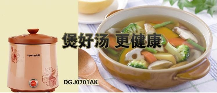 产品名称:Joyoung/九阳 品牌:Joyoung/九阳 型号:DGJ0701AK 控制方式:机械式 锅煲材质:紫砂 锅煲功能:煲汤 煮粥 锅煲容量:小于1L(不含1L) 功率:100-199W 售后服务:全国联保 预约功能:无 液晶显示:无